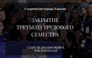 13 декабря состоится «закрытие трудового сезона» или правильнее сказать – «закрытие Третьего трудового семестра» студенческих отрядов Хакасии. Около 200 бойцов студенческих отрядов со всей республики соберутся вместе, чтобы подвести итоги трудового лета и активного года в целом.