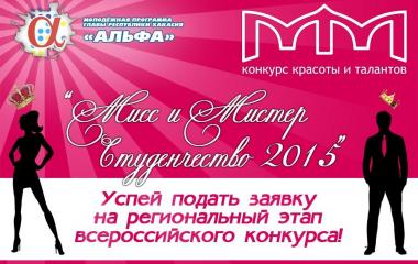 Молодежная программа Главы Хакасии «АЛЬФА» объявляет о приеме заявок на участие в конкурсе «Мисс и Мистер Студенчество - 2015». В этом году «Мисс и Мистер Студенчество» - это не только республиканский молодежный проект, но и региональный этап всероссийского конкурса. Победительница которого, поедет представлять всё студенчество Хакасии на общероссийский конкурс "Мисс Студенчество России - 2015".