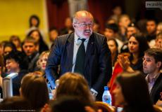 зрителей фойе, баннеры каждого участника в полный рост, корреспонденты,