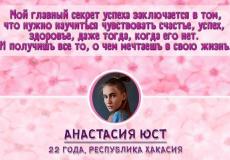 - Настя, тебе 22 года ты не только умна, красива, но и талантлива. Такая гамма черт и принесла тебе победу, позволив носить титул «Мисс Студенчество Хакасии». Хочется знать, с чего же всё начиналось. Расскажи немного о себе: чем ты увлекалась с детства, о чем мечтала, и чего уже удалось добиться?