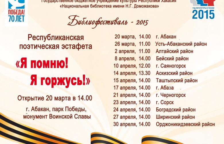 С 20 марта по 30 апреля 2015 года в республике пройдет поэтическая эстафета «Я помню! Я горжусь!», посвященная 70-летию Победы в Великой Отечественной войне и Году литературы
