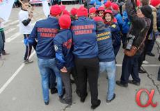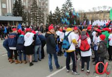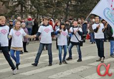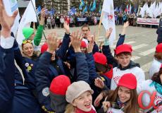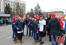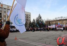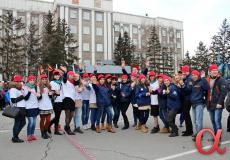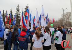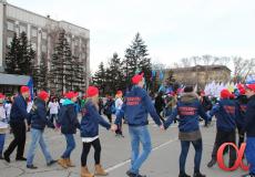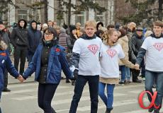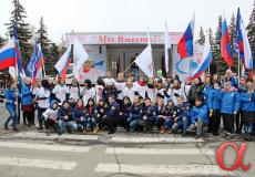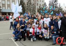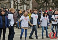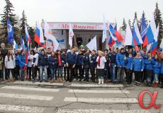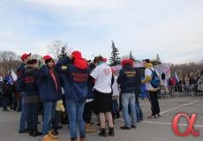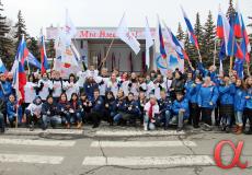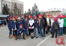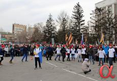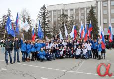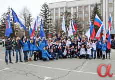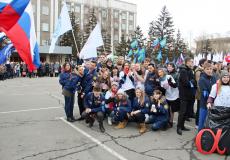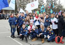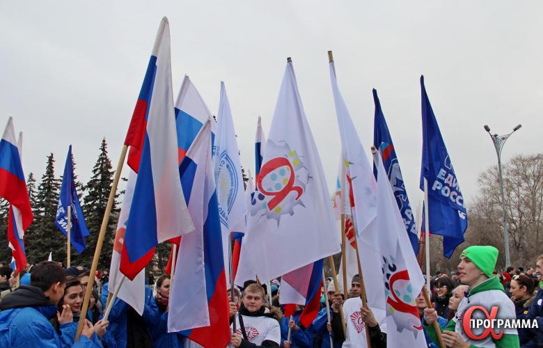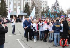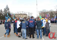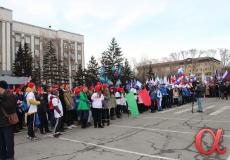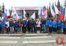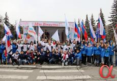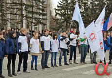 Митинг открылся проведением флешмоба «Мы вместе». В нем приняли участие представители молодежной программы «Альфа», регионального отделения организации «Российские студенческие отряды», «Волонтеры Победы», члены «Молодой гвардии», студенты республиканских вузов. Сотни молодых волонтеров выстраивали на площади различные фигуры, символизируя собой многонациональную Россию. Затем молодые люди объединились в один общий круг, тем самым показав единство и величие родной земли.