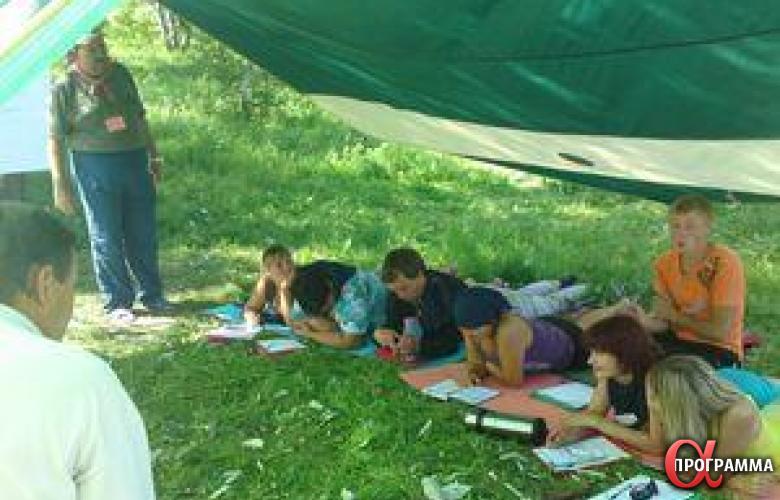 Все занятия, встречи и обсуждения проходили под открытым небом в тени полога. Каждый участник мог устроиться на своем туристическом коврике как ему удобно: лежа, сидя, облокотясь на соседа.