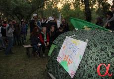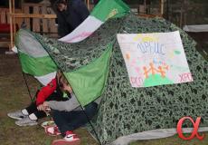 полчаса превратилась в стилизованный палаточный лагерь. Строительные каски,